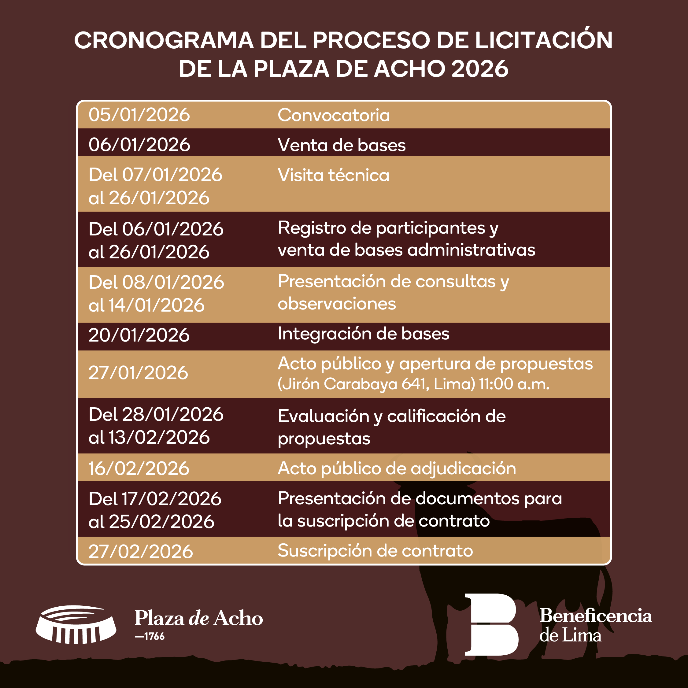 Leer másLa Beneficencia de Lima convoca al Concurso Privado para el “Arrendamiento de la Plaza de Toros de Acho por el periodo de 2023 al 2028” Dicho arrendamiento requiere que el arrendador corresponda a un operador de eventos taurinos, culturales, de espectáculos, entre otros, que ofrezca una administración responsable, eficiente, eficaz y satisfactoria en términos de calidad de eventos, cuidados y lucimiento del inmueble; así como recuperar, gestionar y ofrecer comercialmente un gran escenario prop