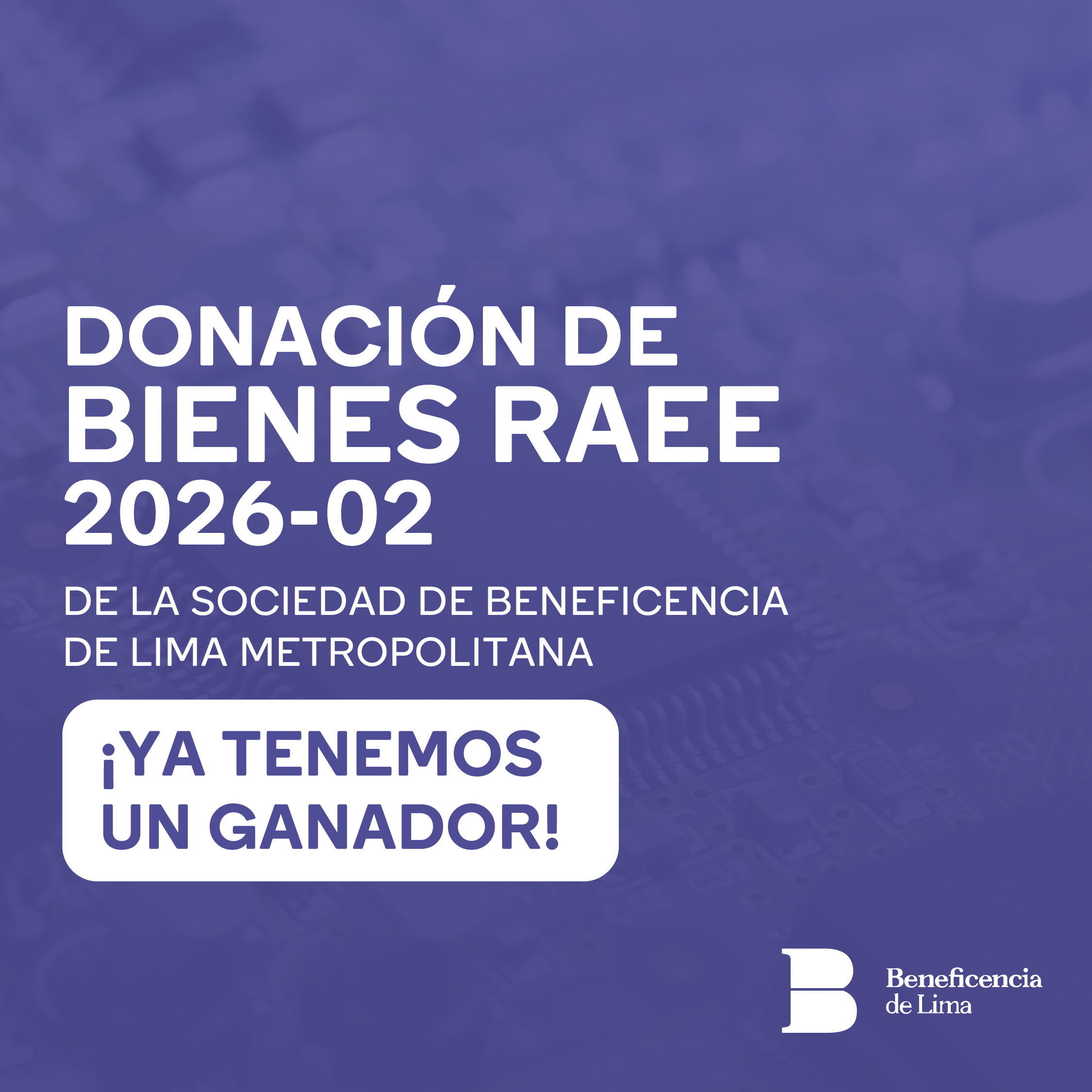 La Sociedad de Beneficencia de Lima Metropolitana informa que la empresa A & J Servicios de Telecomunicaciones y Comerciales E.I.R.L. obtuvo la adjudicación de la Donación de bienes clasificados como RAEE 2026-02.