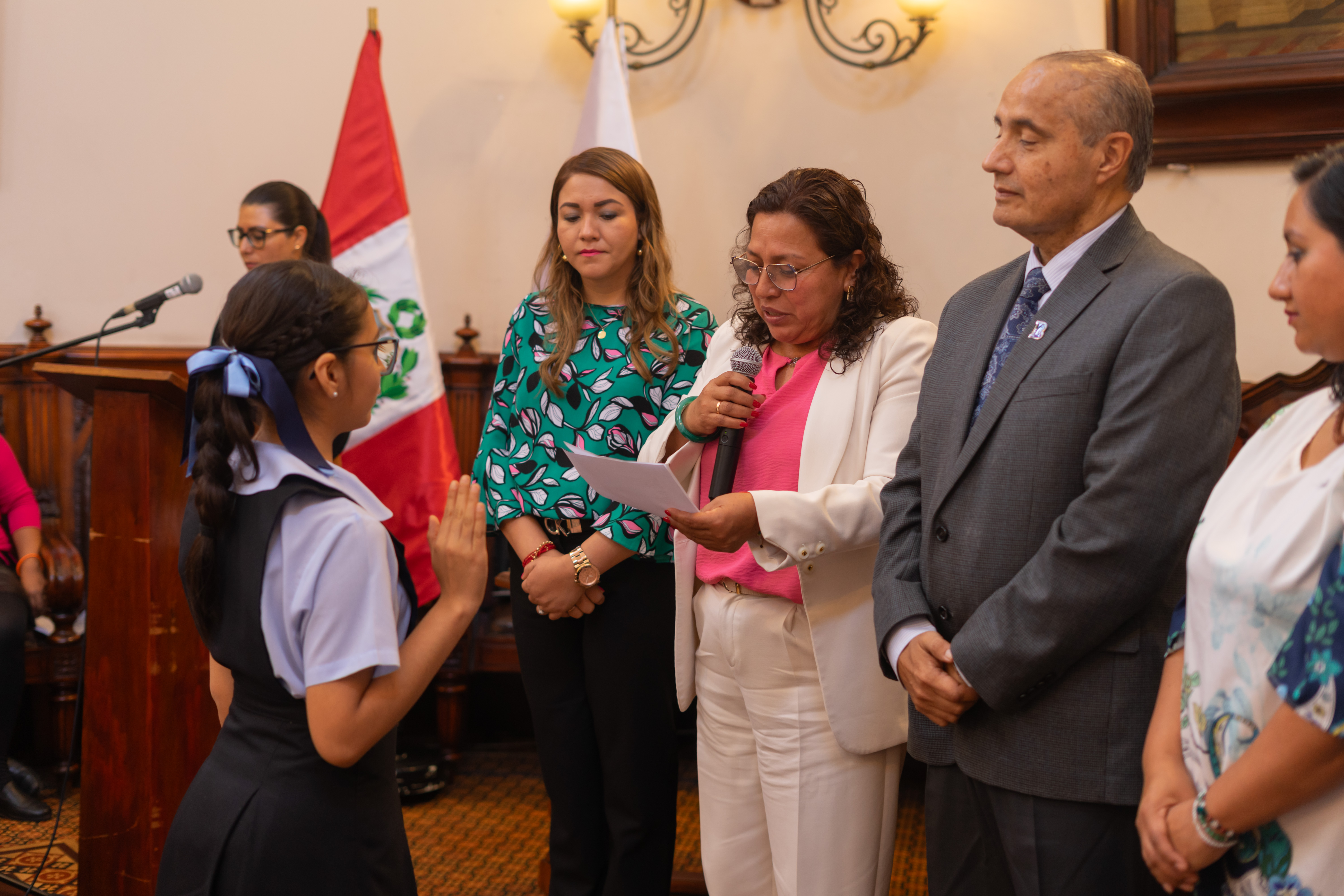 “No tengo ninguna duda de que frente a mí se encuentran las autoridades que el Perú tendrá en el futuro. Estoy convencida de que ustedes serán grandes líderes desde el lugar que les toque ocupar: hoy en sus colegios, mañana en sus distritos, en Lima Metropolitana o incluso a nivel nacional”, expresó la ministra tras tomar el juramento simbólico de las lideresas escolares.