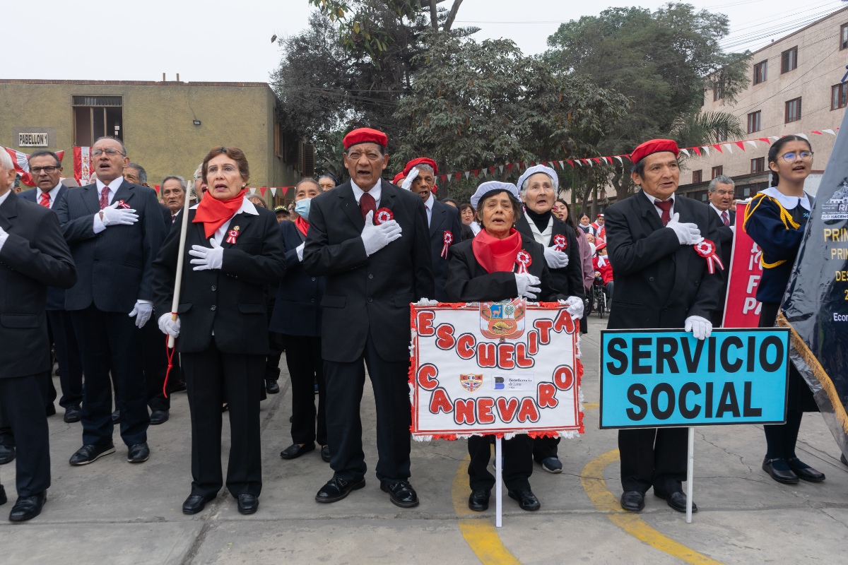 En el Hogar Canevaro, los adultos mayores participaron en el tradicional desfile patriótico, donde demostraron su entusiasmo y espíritu cívico. La jornada contó además con la presentación musical de las estudiantes del Instituto Sevilla, emblemático colegio administrado por la Beneficencia de Lima.