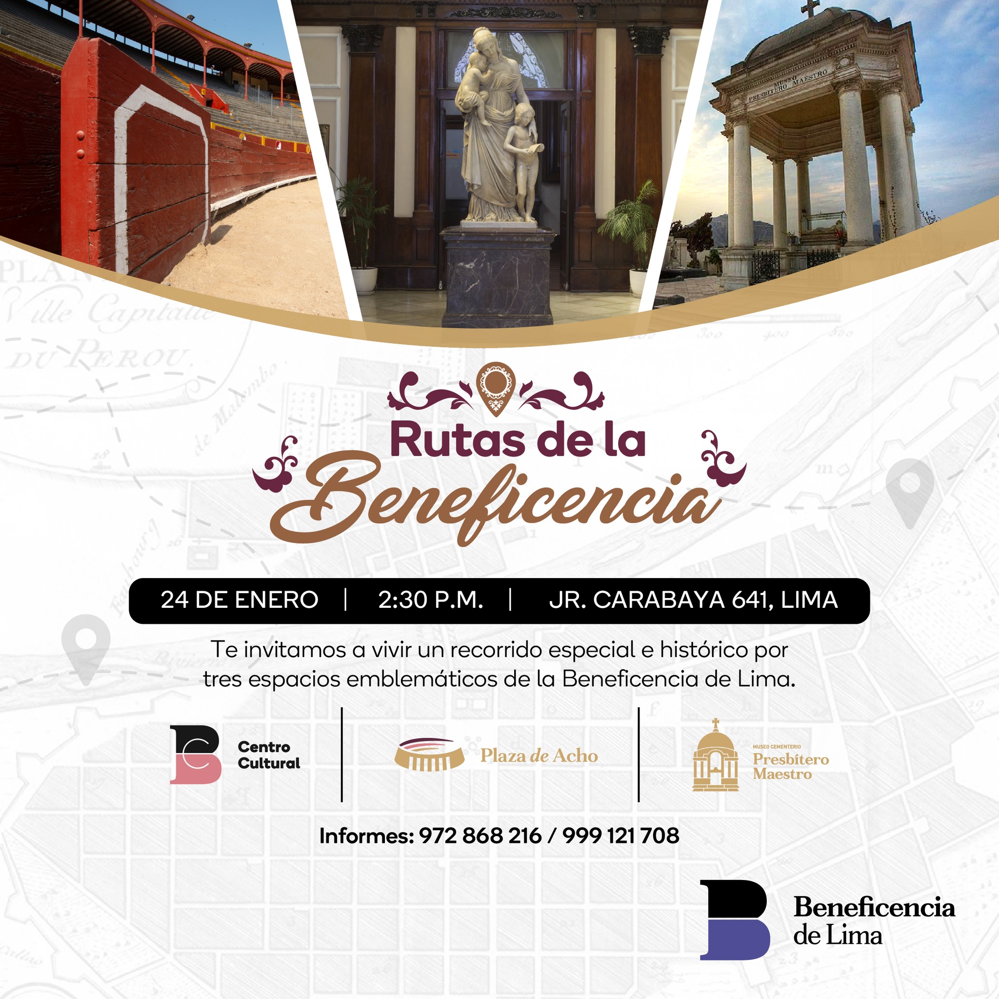 Las personas interesadas pueden reservar sus entradas comunicándose a los teléfonos 972 868 216 y 999 121 708. Los fondos recaudados permitirán a la Beneficencia de Lima continuar con la conservación del patrimonio cultural que administra y fortalecer sus programas sociales en beneficio de la población más vulnerable.