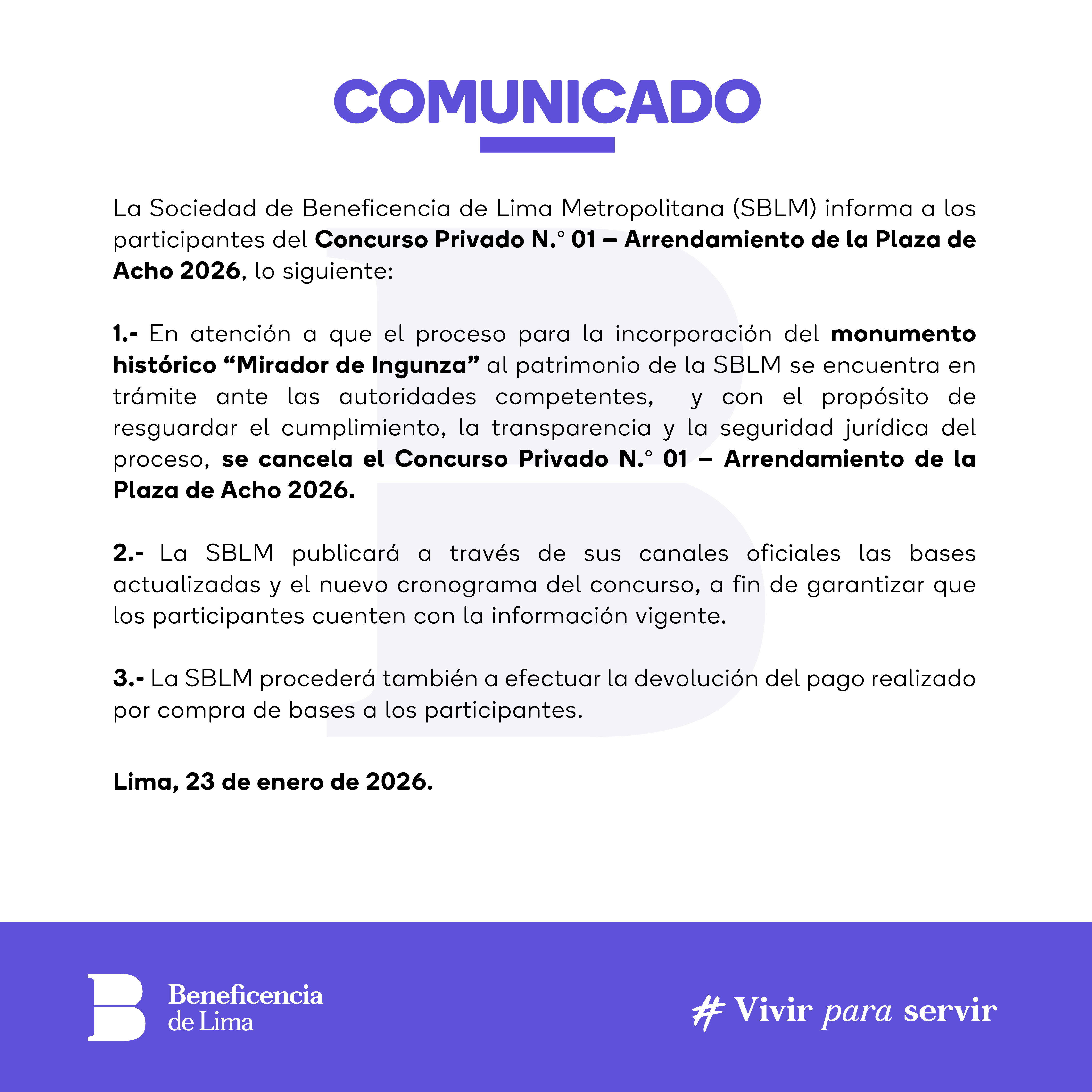 La Sociedad de Beneficencia de Lima Metropolitana (SBLM) informa a los participantes del Concurso Privado N.° 01 – Arrendamiento de la Plaza de Acho 2026, lo siguiente: